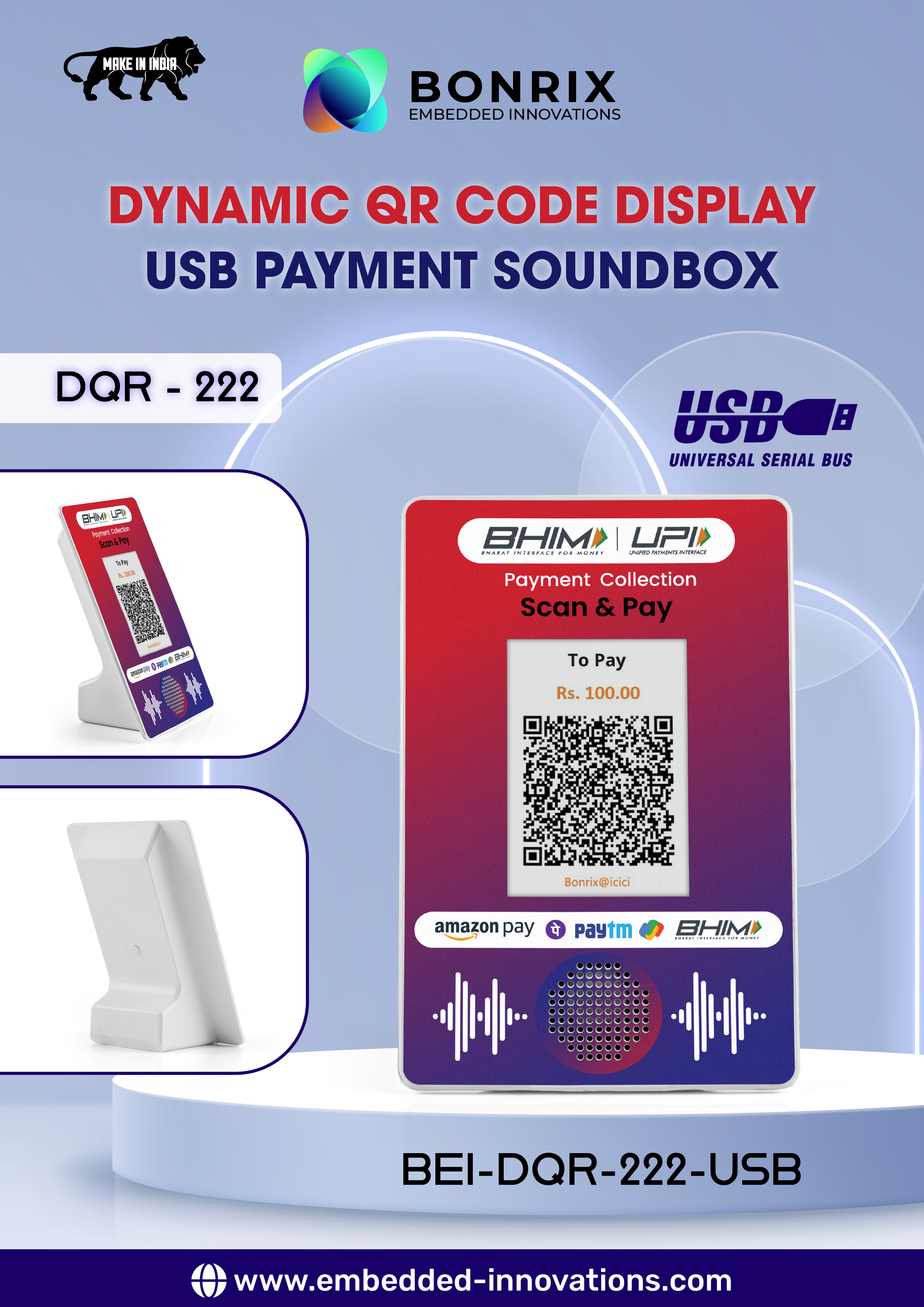 - BEI-DQR-111-USB: Digital QR - USB Payment Soundbox + Dynamic QR Display