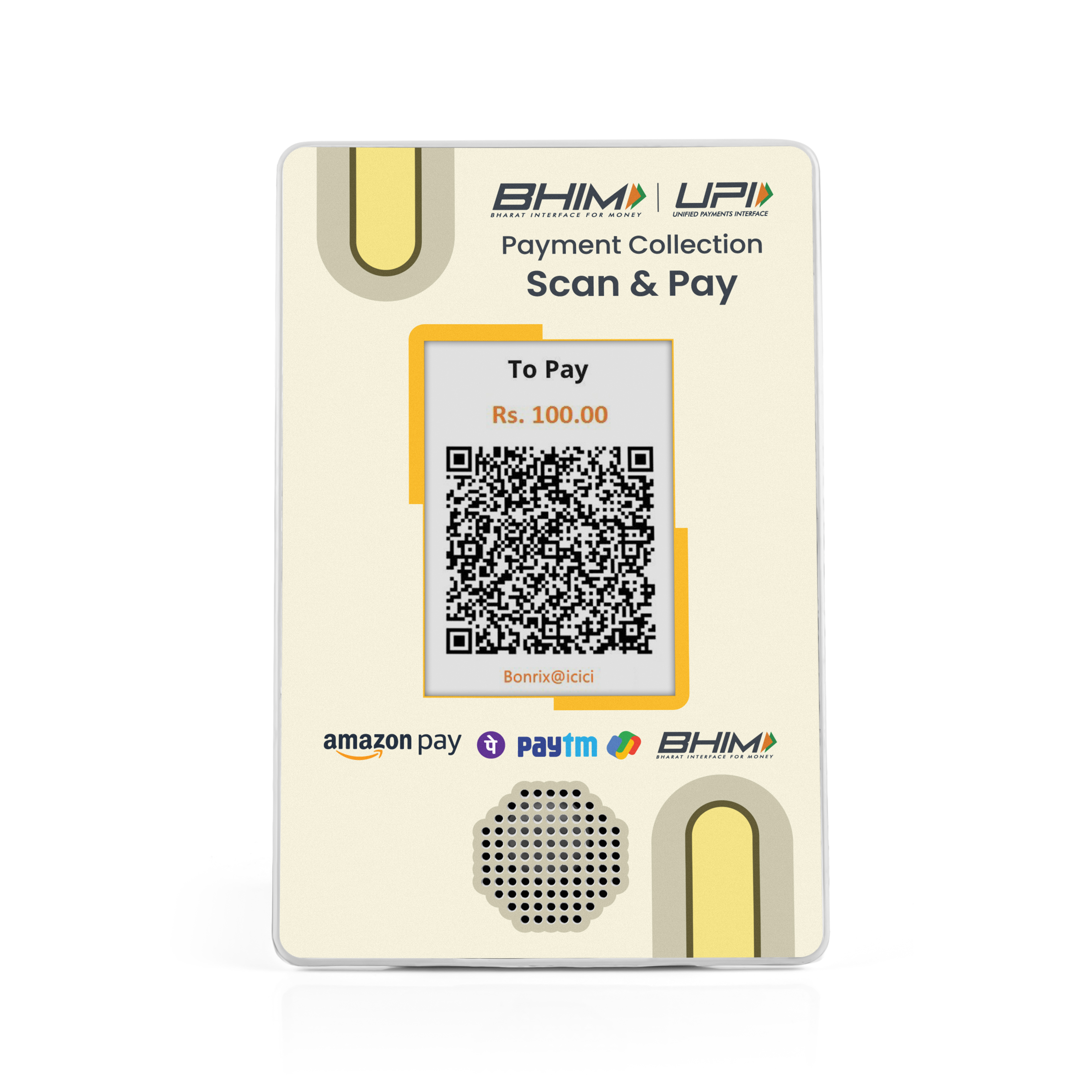 • Universal Compatibility: Integrates effortlessly with Paytm, PhonePe, BharatPe, GPay, and all bank QR systems.